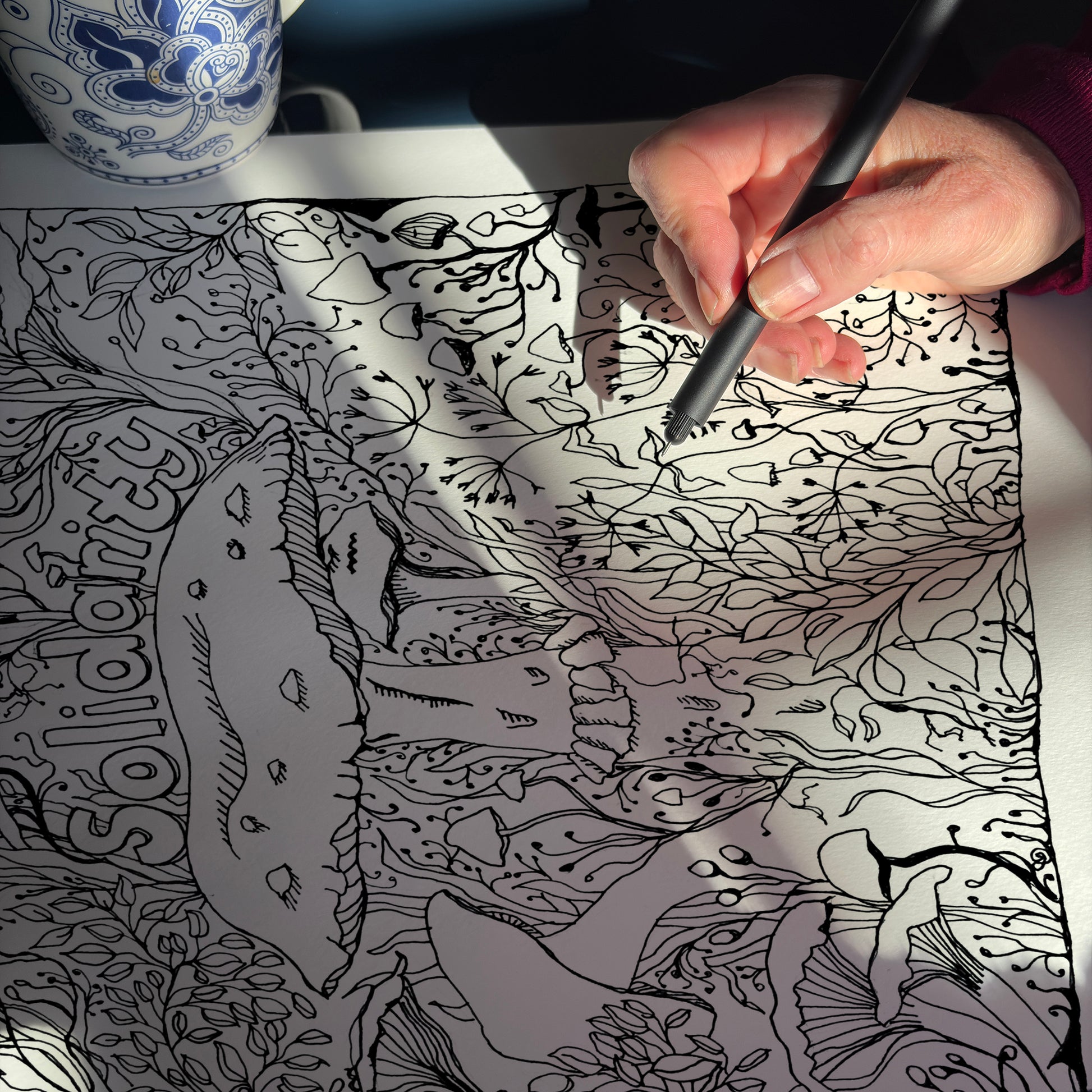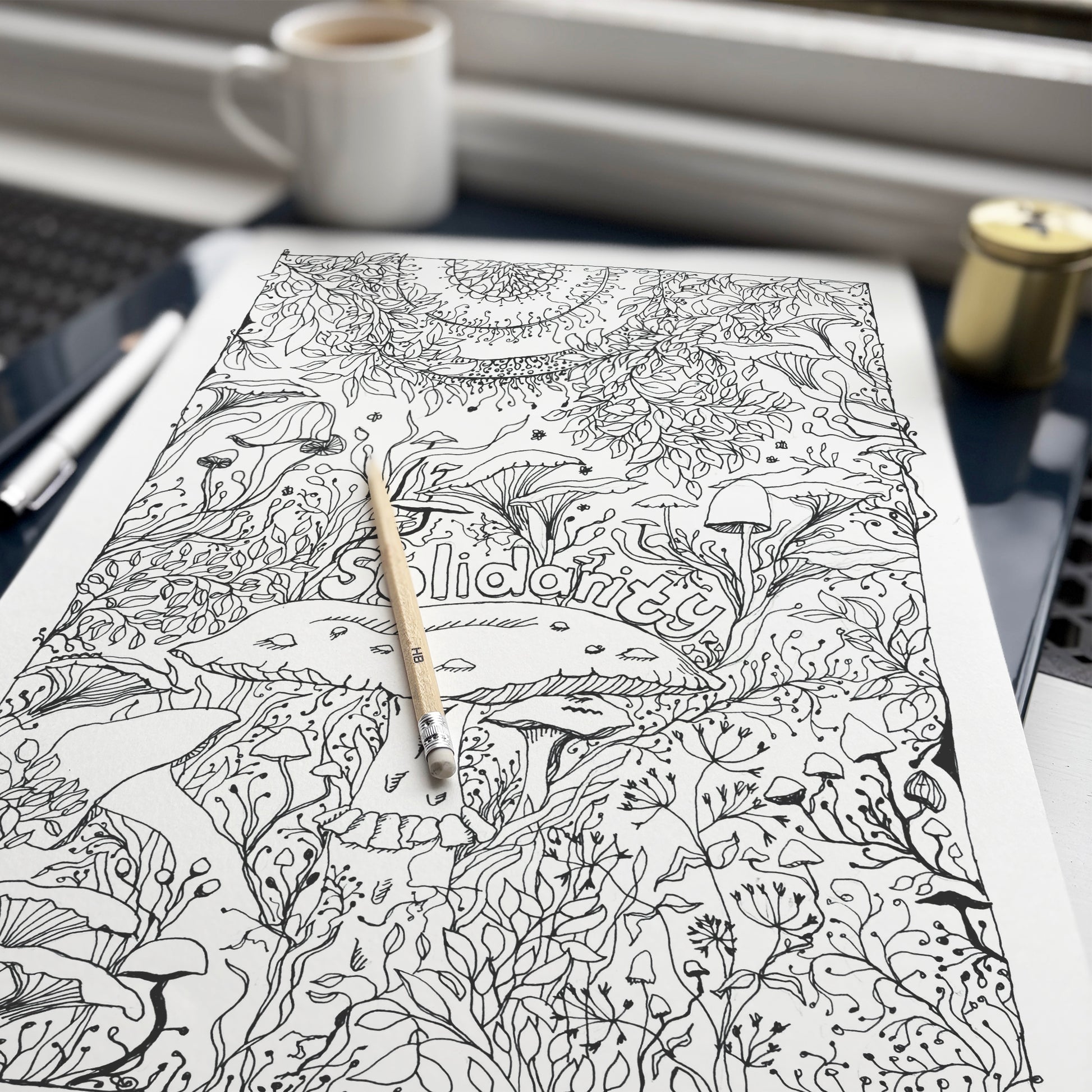 ‘Solidarity’ is a pen and ink drawing inspired by the hidden networks beneath our feet; the mycelium that links roots, trees, and fungi in quiet cooperation. Above ground, mushrooms rise together. Below, their threads are intertwined, strong because they are connected.