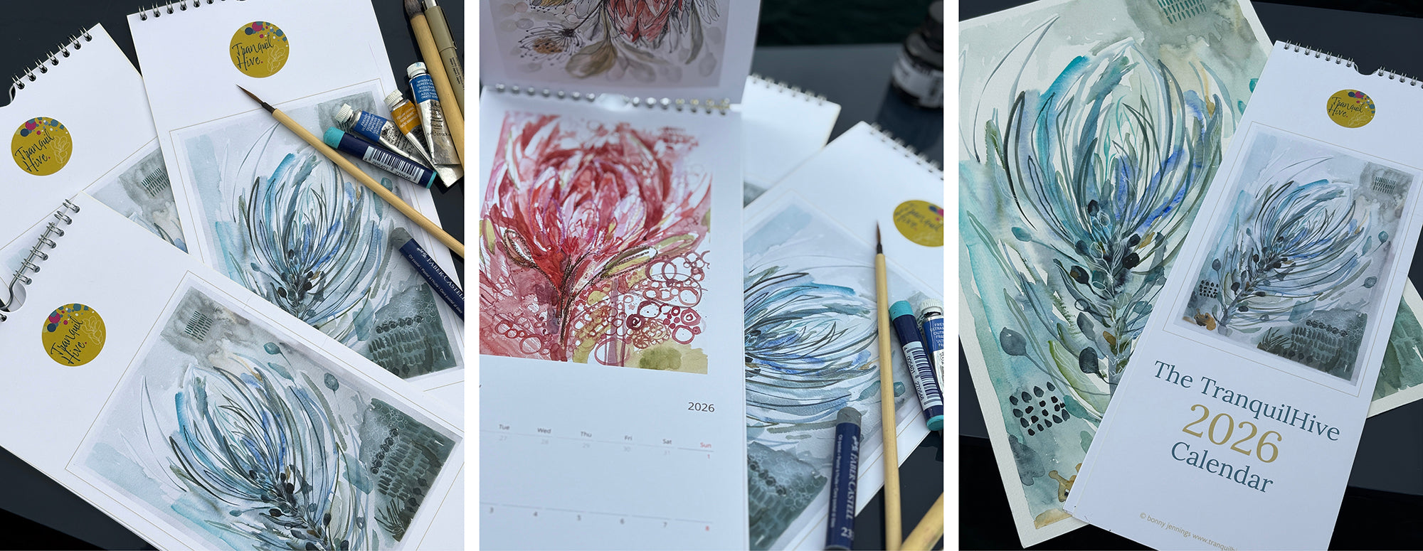 Elevate your space with the TranquilHive 2026 Calendar, featuring stunning protea artwork by artist Bonny Jennings. Each month brings a unique, vibrant representation of these resilient flowers, symbolising fortitude and inspiration during challenging times.